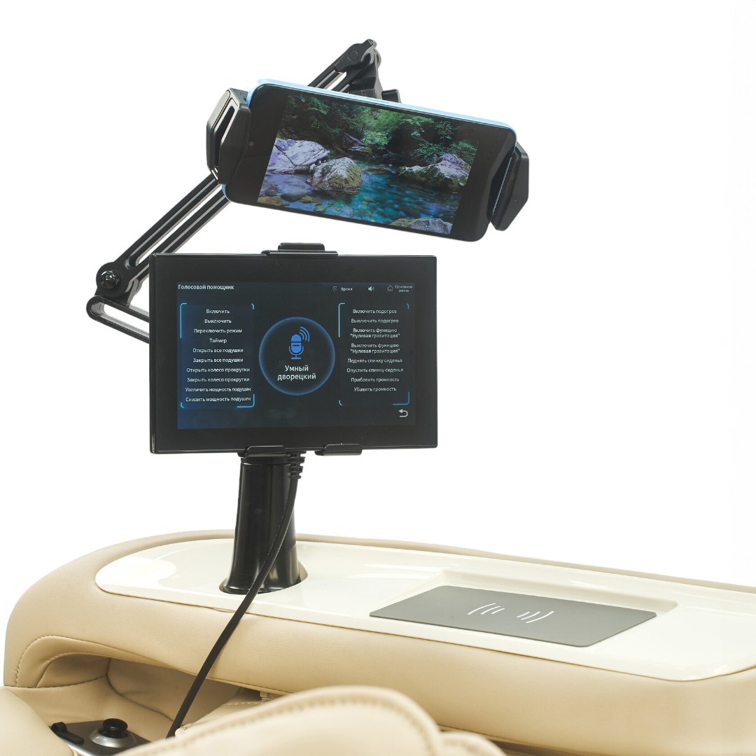 • В комплекте удобная подставка под телефон или планшет, которым можно управлять специальным джойстиком, встроенным в подлокотник, не отвлекаясь от массажа