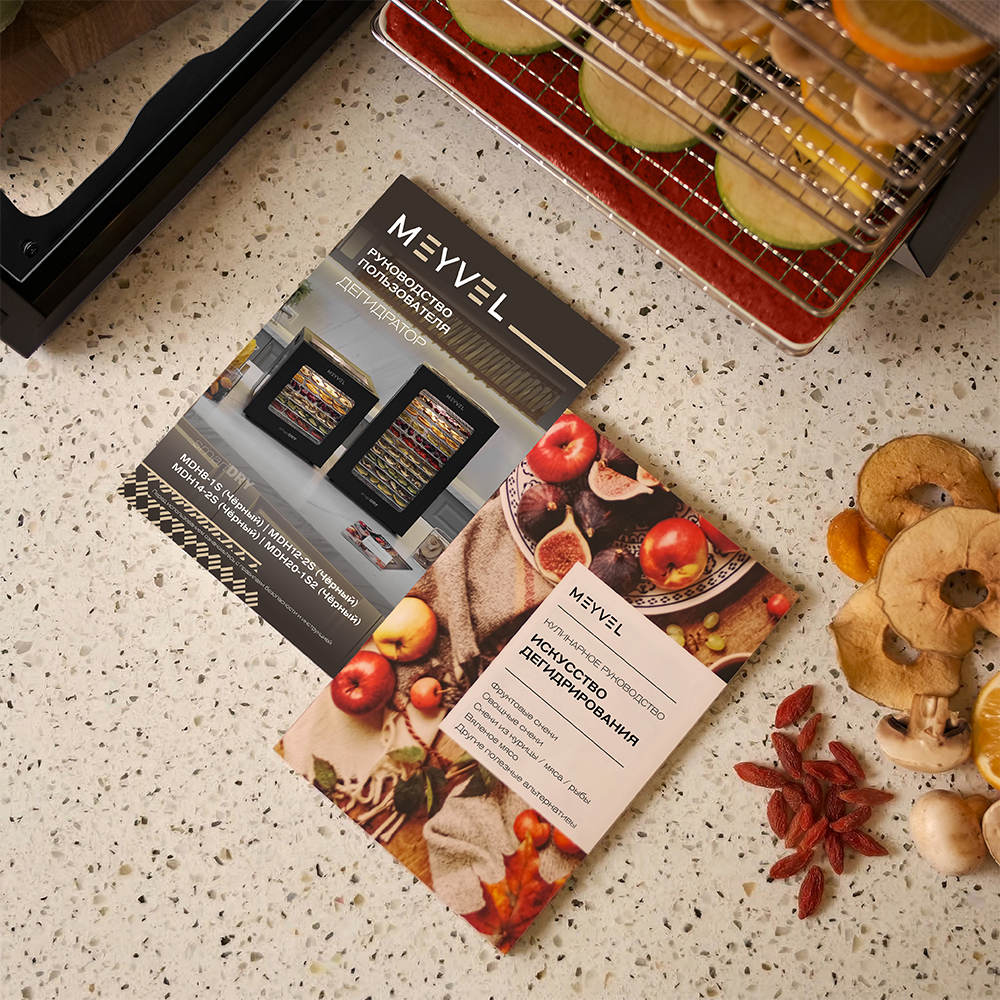 Meyvel MDH12-2S (Чёрный) (Black) — это современный дегидратор, который создан для тех, кто хочет заготавливать фрукты, овощи, мясо, травы и ягоды без потери их вкуса и пользы круглый год. Прочный корпус, продуманная конструкция и умная электроника превращают его в надёжного помощника на каждый сезон.