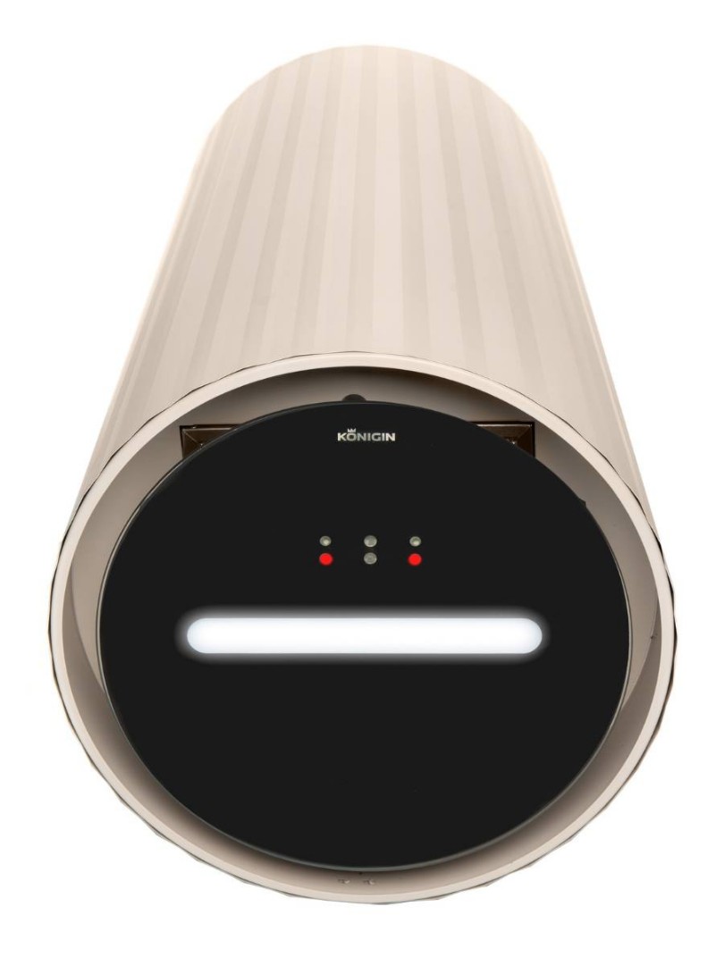 Данная модель оснащена системой управления, распознающей движения рук (жесты) под вытяжкой на стеклянной декоративной панели. Светодиодный индикатор, отображает текущую скорость работы вытяжки определенным цветом (синий, фиолетовый, зеленый, красный). Цвет диода отображается на поверхности варочной плиты, расположенного под вытяжкой.